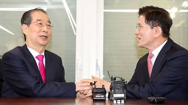 ▲ 국민의힘 김문수 대선 후보와 한덕수 전 국무총리가 11일 서울 여의도 국민의힘 대선후보 사무실에서 회동하고 있다. (사진=공동취재, 연합뉴스)