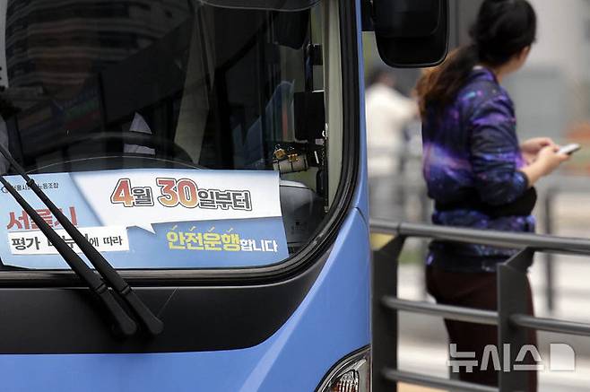 [서울=뉴시스] 최동준 기자 = 전국 버스 노조 조정신청을 하루 앞둔 11일 서울 중구 정류장에 정차한 버스 운전석에 '안전운행' 피켓이 놓여있다. 2025.05.11. photocdj@newsis.com