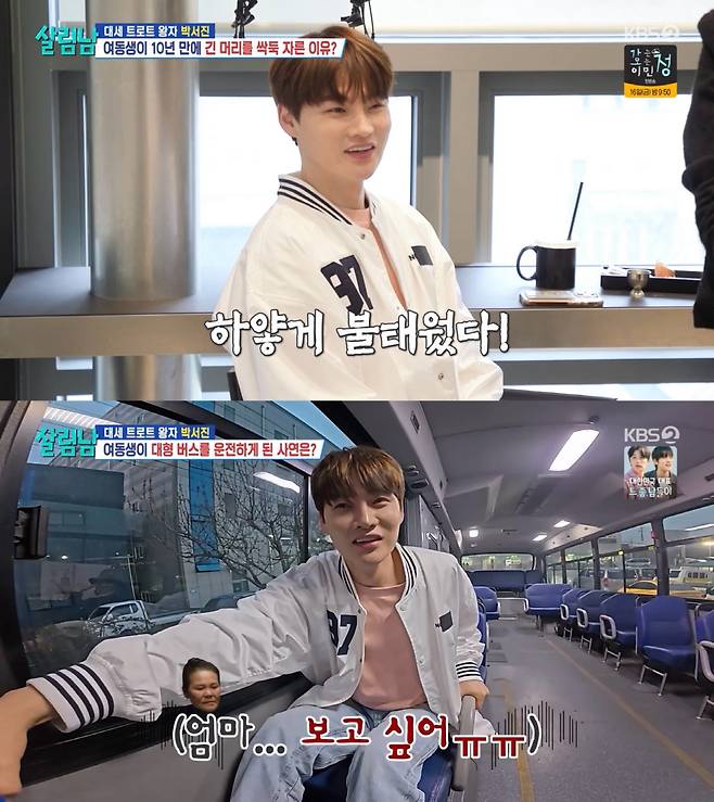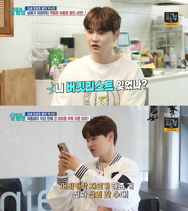 지난 10일 방송된 KBS2 '살림하는 남자들 시즌2'(이하 '살림남')에서 박서진은 박효정이 새로운 도전들을 할 수 있도록 자극하며 또 하나의 무해한 에피소드를 만들어냈다. 박서진은 앞서 적었던 2025년 버킷리스트를 언급하며 '단발머리로 커트하기'를 박효정에게 제안했다. "마음을 다져준다 생각하고 단발로 변신하자"고 권유한 박서진은 미용실까지 동행하며 동생에게 용기를 줬다. 이어 10년 만의 단발을 앞두고 걱정하는 박효정에게 "머리카락을 만져보니까 많은 아픔이 느껴진다"는 말과 함께 엉뚱한 상황극을 펼치며 현실 남매 다운 유쾌한 케미도 잊지 않았다.