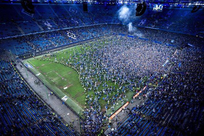 종료 휘슬이 불리자 말 그대로 축제가 시작됐다. 함부르크 팬들은 일제히 경기장으로 뛰어들어 7년간 기다렸던 승격의 순간을 즐겼다. 이들은 선수들과 한 데 엉켜 노래를 부르며 기뻐했고, 골대 그물을 잘라가기도 했다. 홈 구장의 잔디를 기념으로 챙겨가는 팬들도 적지 않았다.