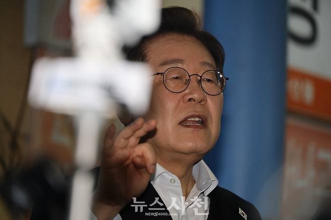 | ▲ 더불어민주당 이재명 대선 후보가 10일 경남 사천시 사천읍시장을 찾아 지지자와 소공상인들을 만났다. 이날 김경수 더불어민주당 중앙선거대책위원회 총괄선대위원장도 함께 시천읍시장을 방문해 지지를 호소했다. |