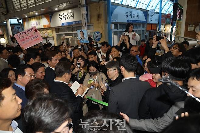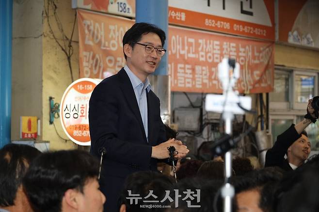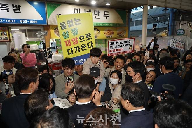 이날 사천읍시장에서 '경청투어'를 진행한 이 후보는 지지자들의 목소리에 귀 기울였다. 이날 사천읍시장은 사천시민 외에도 인근 지역 주민들이 대거 몰려 인산인해를 이뤘다. 이날 지지문구 손팻말 외에도 지역의 현안이나 어려운 현안 해결을 당부하는 팻말도 눈길을 끌었다.