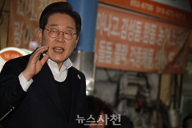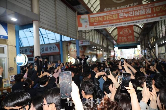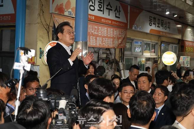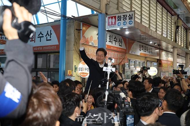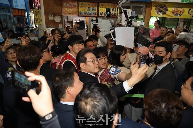 | ▲ 더불어민주당 이재명 대선 후보가 10일 경남 사천시 사천읍시장을 찾아 지지자와 소공상인들을 만났다. |