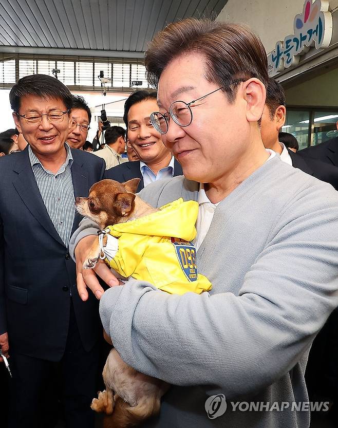 (강진=연합뉴스) 김도훈 기자 = 남도문화벨트 골목골목 경청투어에 나선 더불어민주당 이재명 대선 후보가 11일 전남 강진군 강진읍 강진오감통시장을 찾아 한 지지자의 반려견을 품에 안고 인사를 하고 있다. 2025.5.11