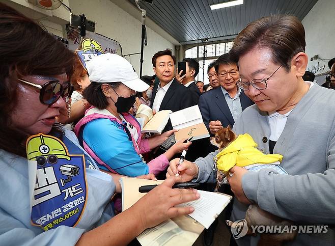(강진=연합뉴스) 김도훈 기자 = 남도문화벨트 골목골목 경청투어에 나선 더불어민주당 이재명 대선 후보가 11일 전남 강진군 강진읍 강진오감통시장을 찾아 한 지지자의 반려견을 품에 안고 인사를 하고 있다. 2025.5.11