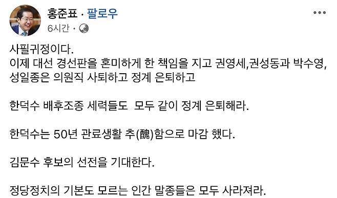 홍 전 시장은 11일 자신의 SNS를 통해 "사필귀정"이라면서 "이제 대선 경선판을 혼미하게 한 책임을 지고 권영세, 권성동과 박수영, 성일종은 의원직 사퇴하고 정계 은퇴하라"며 이같이 말했다.