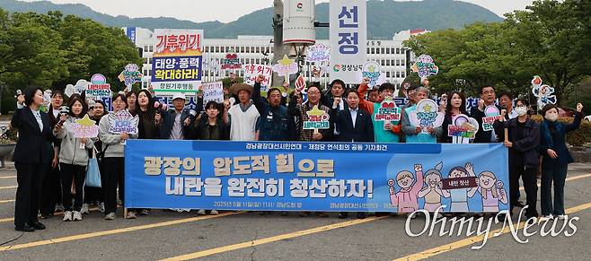 경남광장대선시민연대와 더불어민주당·조국혁신당·진보당·기본소득당 경남도당은 11일 오전 경남도청 앞에서 "광장의 압도적 힘으로 내란을 완전히 청산하자"라고 밝혔다.