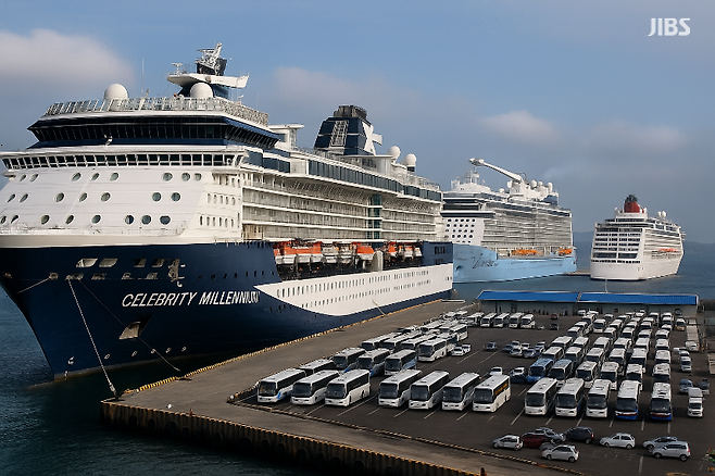 11일 제주도에 따르면 10일 하루 동안 히로시마발 ‘셀러브리티 밀레니엄’호(9만 톤), 텐진발 ‘오베이션 오브 더 씨’(17만 톤), 상하이발 ‘아도라 매직시티’호(13만 톤) 등 총 3척의 대형 크루즈가 잇따라 입항했습니다.
