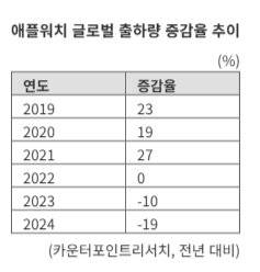 11일 시장조사기관 카운터포인트리서치에 따르면 지난해 애플워치 출하량은 전년 대비 19% 감소했다. 인도를 제외한 모든 지역에서 출하량이 줄었다. 애플워치 전체 출하량의 절반 이상을 책임지는 북미 시장 판매 부진이 가장 큰 영향을 미쳤다. 애플워치는 2022년 0%에 이어 2023년(-10%) 역성장을 나타내며 2년 연속 두 자릿수 감소세를 보였다. 애플워치 출하량 증가율은 2021년(27%)을 정점으로 3년째 하락세를 그리고 있다. 분기 기준으로도 최근 5분기 연속 전년 대비 출하량이 줄었다. 글로벌 인플레이션 가속화로 인한 구매력 저하 등에 고가의 애플워치를 구매하려는 시장 수요가 크게 하락한 것으로 분석됐다.