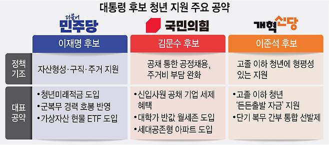 이재명 더불어민주당 대선후보는 자산 형성, 구직 지원, 주거 지원 등을 약속했다. 자산 형성을 위해서는 '청년내일채움공제 시즌2'로 청년미래적금을 도입한다. 가상자산을 제도권으로 끌어들이기 위해 가상자산 현물 ETF를 도입하고 통합감시시스템을 구축해 안전한 투자 환경을 조성하는 게 골자다.