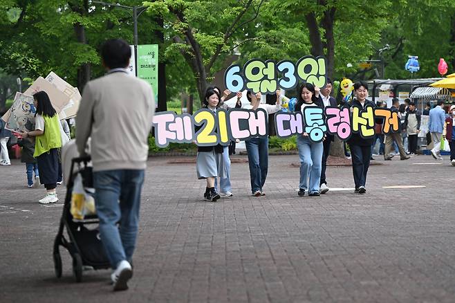 제21대 대통령선거 공식 선거운동을 하루 앞둔 11일 서울 광진구 서울어린이대공원에서 서울시선거관리위원회 직원들이 투표 참여 홍보캠페인을 진행하고 있다.
