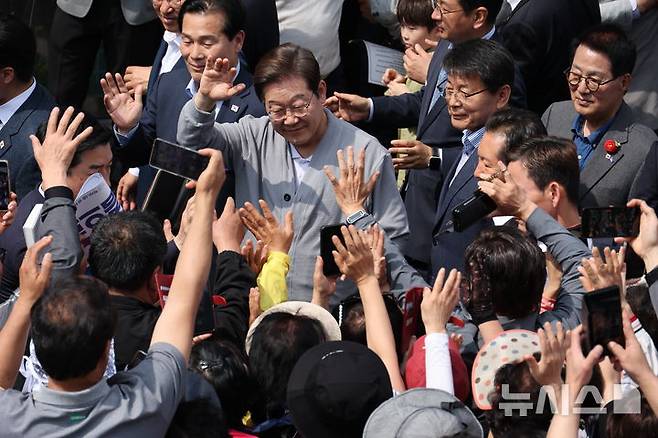 [영암=뉴시스] 조성우 기자 = 민심을 청취하는 '경청 투어'에 나선 이재명 더불어민주당 대선후보가 11일 전남 영암군 독천터미널 인근에서 군민들과 인사를 나누고 있다. 2025.05.11. xconfind@newsis.com