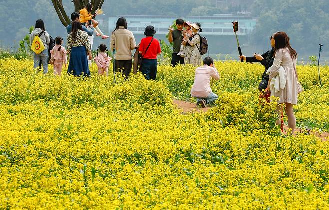 11일 경기도 구리한강시민공원에서 2025 구리 유채꽃 축제가 열린 가운데 흐드러지게 핀 유채꽃밭을 시민들이 산책하고 있다.구리 유채꽃 축제는 형형색색 봄의 정취가 가득한 한강변을 배경으로 펼쳐지는 수도권의 대표 봄꽃 축제이다.