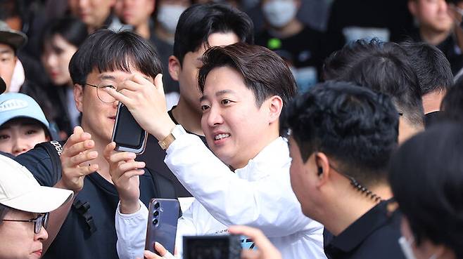 ▲ 개혁신당 이준석 대선 후보가 11일 오전 부산 해운대구 벡스코 일대에서 열린 다이아몬드브릿지 걷기 축제에 참가해 시민들에게 인사하고 있다.