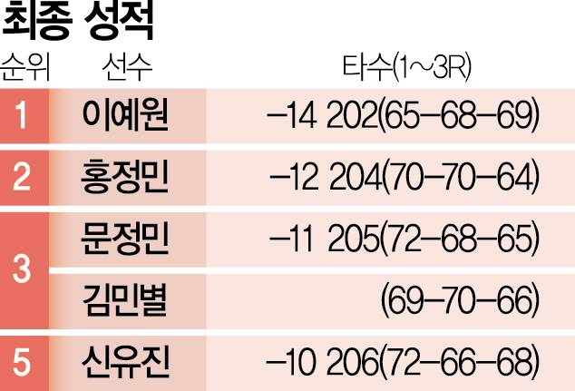 7타를 줄인 문정민과 6언더파를 친 김민별은 공동 3위(11언더파)에 만족했다. 1라운드 공동 6위였던 방신실은 손목 통증으로 2라운드 도중 기권했다. 검진 결과는 단순 건초염. 방신실은 대상 포인트 2위, 상금 3위로 내려갔다.