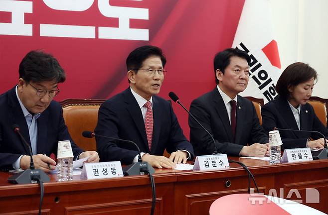 [서울=뉴시스] 고승민 기자 = 김문수 국민의힘 대선 후보가 11일 서울 여의도 국회에서 열린 중앙선거대책위원회의에서 발언하고 있다. 2025.05.11. kkssmm99@newsis.com