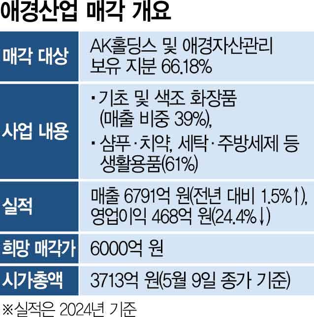 이번 매각 대상은 AK홀딩스와 애경자산관리가 보유한 애경산업 지분 66.18%다. 회사가 원하는 매각 가격은 6000억 원이다. 100% 기준 회사의 가치를 약 1조 원으로 평가했다는 얘기다. 그러나 상장사인 애경산업의 지난 9일 종가 기준 시가총액이 3713억 원에 불과해 원매자의 희망 인수가격과 격차가 클 것이라는 전망이 나온다.