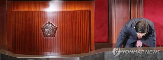 김 후보는 연단 옆으로 옮겨가 큰 절을 했고, 의원들은 기립 박수를 쳤다.