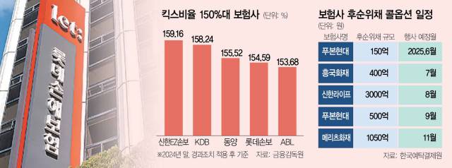 이들 업체는 킥스 비율이 상대적으로 낮다. 지난해 말 경과 조치 시행 이후 기준으로 150%대인 보험사는 △롯데손보 154.59% △푸본현대 157.3% △KDB생명 158.24% △현대해상 157% 등이다.