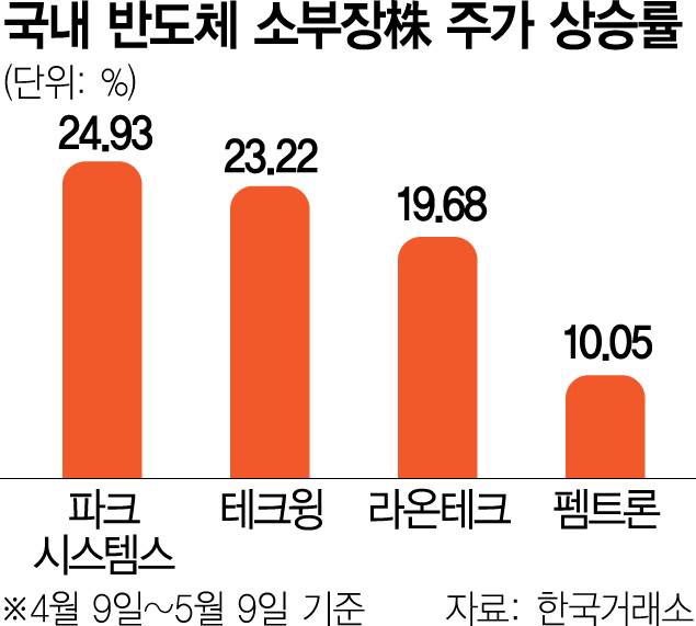 11일 한국거래소에 따르면 반도체 검사 장비 전문 기업 파크시스템스(140860)는 지난달 9일부터 이달 9일까지 최근 한 달간 주가가 24.93% 급등했다. 같은 기간 진공 로봇 제조 기업인 라온테크(232680)는 19.68%, 3D 검사 장비 업체인 펨트론(168360)은 10.05%, 테크윙(089030)은 23.22% 올랐다. 이들은 주로 HBM과 진공 공정 분야에서 기술 경쟁력을 인정받고 있는 기업이다.