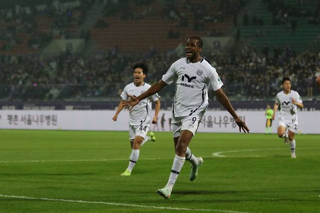 10일 안양종합운동장에서 열린 13라운드 경기에서 안양을 상대로 헤더골을 넣은 뒤 포효하는 에드가.<대구FC 제공>
