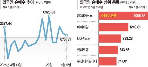 지난 7~9일 외국인은 실적 개선 종목 중심으로 매수세가 뚜렷했다. 이 기간 SK하이닉스를 2066억원어치 가장 많이 매집했다. 이어 에이피알(1241억원), LIG넥스원(933억원), 현대로템(814억원), 두산에너빌리티(747억원) 등 순으로 지난 1·4분기 '실적 서프라이즈'를 기록한 종목이 대부분이었다. 외국인 순매수 상위 10개 종목 중 4개가 방산주였다.