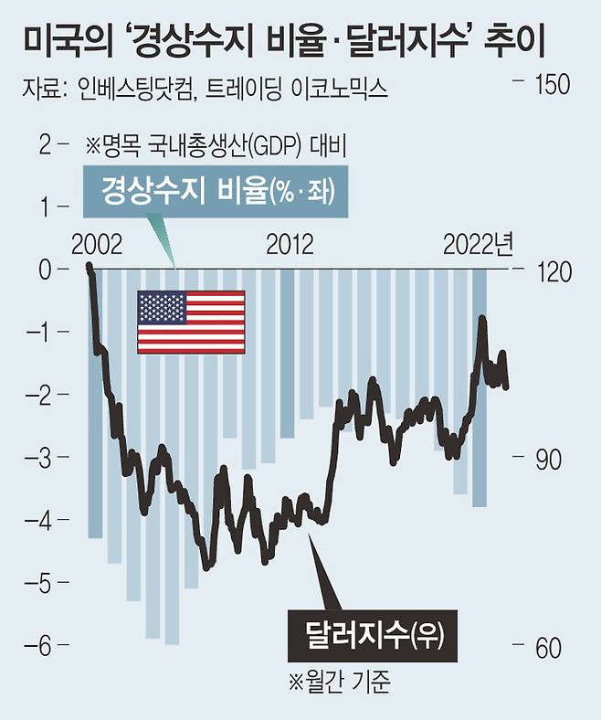 달러가치는 2000년대 들어서 금융위기(2008년) 이전까지 눈에 띄는 약세를 보였다. 공교롭게도 같은 시기 미국의 지디피 대비 경상수지 적자는 고공 행진을 계속했다. 왜 이런 현상이 나타난 걸까?