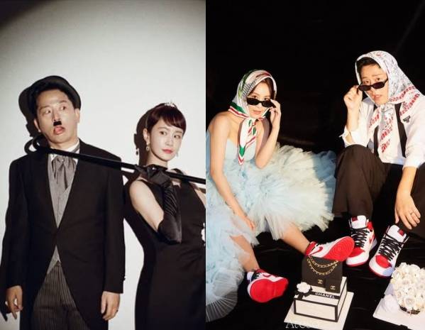 또한 두 사람은 머리에 스카프를 두르고 선글라스를 살짝 내린 커플룩으로 찰떡 호흡을 과시하기도 했다. 김지민은 하늘색 드레스를 입고 바닥에 주저앉는 털털한 매력을 보였고, 특히 두 사람은 강렬한 빨간 운동화와 명품백 케이크로 '힙'한 무드를 완성했다.