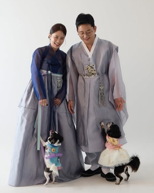 이뿐만 아니라 두 사람은 웨딩드레스와 슈트, 반려견들과 함께 한복을 입고 있는 전통적인 웨딩화보까지 전격 공개해 훈훈함을 자아냈다.