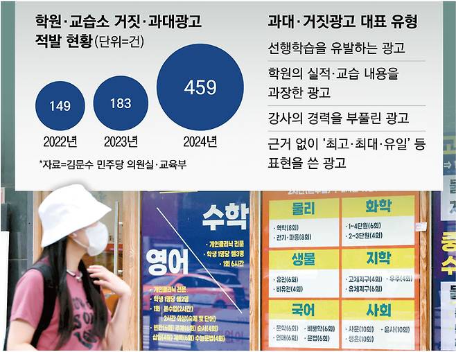 교육부는 △선행학습을 유발하는 광고 △학원의 실적 혹은 교습 내용을 과장한 광고 △강사의 경력을 부풀린 광고 △근거 없이 ‘최고, 최대, 유일’ 등 배타적 표현을 사용한 광고 등을 대표적인 과대·거짓광고 유형으로 꼽았다. 현행 학원법 제17조, 공교육정상화법 제8조에 따르면 학습자를 모집할 때 과대 또는 거짓 광고를 하면 행정처분 대상이 된다.