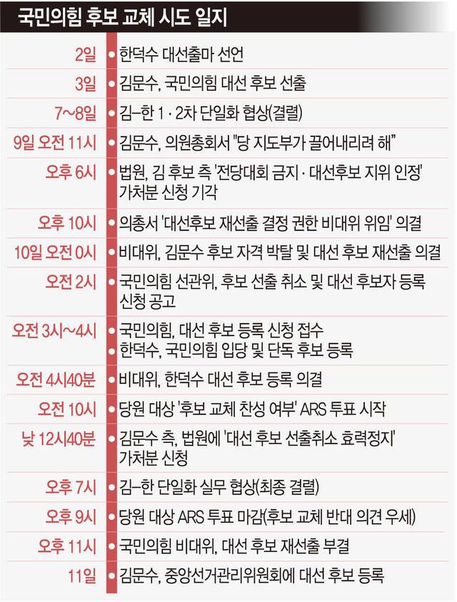 국민의힘은 10일 오전 10시부터 오후 9시까지 전 당원 대상으로 “한덕수 후보로의 변경에 찬성하십니까” 질문에 ‘예’ ‘아니요’로 응답하는 자동응답시스템(ARS) 여론조사를 실시했다. 지도부는 조사 시작 무렵 “김 후보가 단일화 약속을 파기해 당원을 기만했다”고 강조했으나 당원들의 응답은 의외로 ‘아니요’가 많았다. 격차는 근소한 수준이었다고 한다. 권영세 비대위원장은 오후 11시 비대위회의가 끝난 뒤 “모든 책임을 지고 물러나겠다”고 말했다.