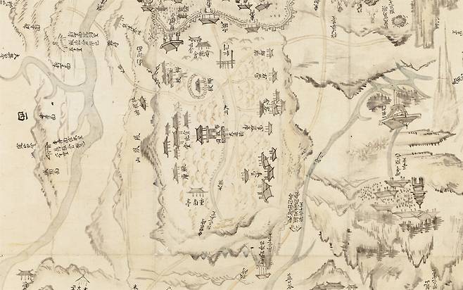 | ▲ 공산성(1872년지방지도_부분) 남문 앞 홍살문이 이채롭다. 영은사와 공북루, 쌍수정이 무척 크게 그려져 있다. 이들 건축물을 중요시 했음을 보여 준다. |