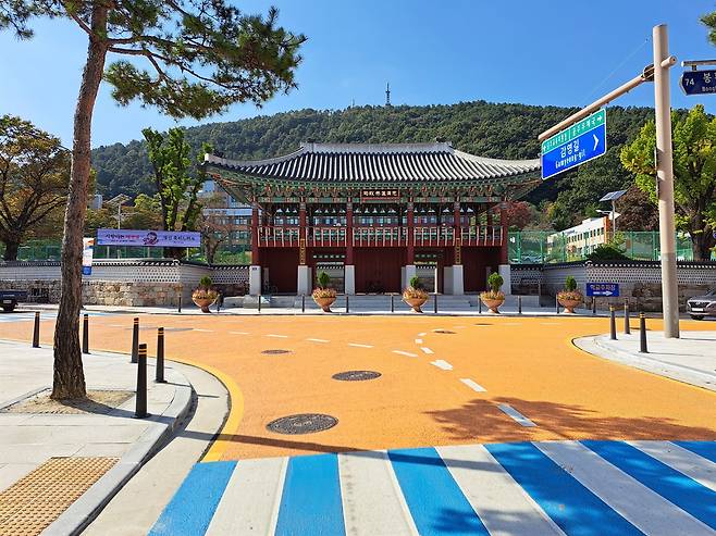 남문으로 향한다. 위급에 처하면 이 길로 충청감영이 피신했을 터이다. 어딘 건 홍살문은 흔적도 없다. 짧은 호흡에 숨이 차오르고, 진남루가 의젓하다. 낮은 양 계곡 사이에 절묘하게 자리 잡았다. 바로 인접해 왕궁이니, 방어의 제1 관문인 셈이다.