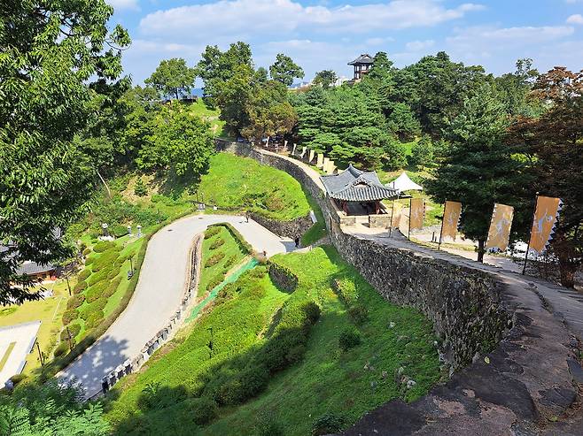 | ▲ 금서루와 서벽 공산성 서문인 금서루와 서벽. 사진에서 금서루 위쪽 높은 자리에 공산정의 모습이 보인다. |