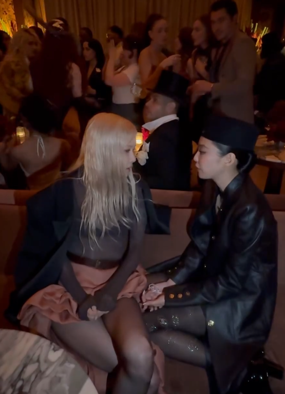 공개된 사진 속 로제는 함께 참석한 제니의 무릎 위에 앉고, 나란히 마주해 대화를 나누는 등 우정을 보였다.