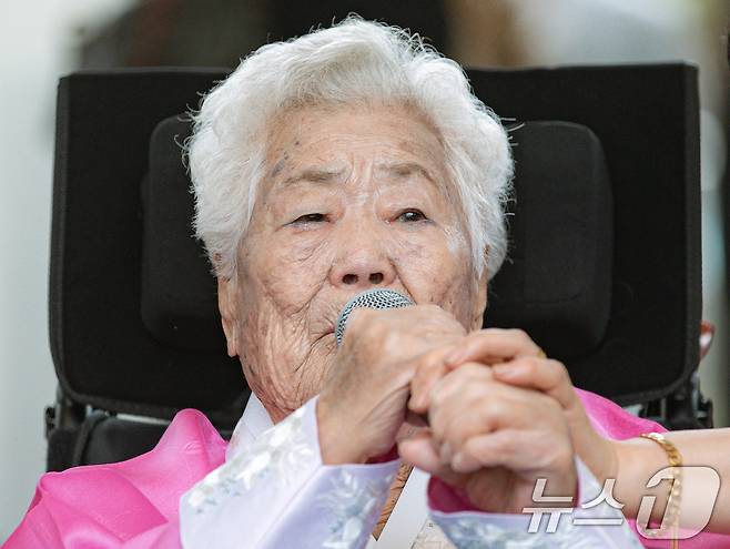 사진은 지난 2023년 8월12일 경기도 광주 나눔의집에서 열린 '일본군 위안부 피해자 기림의 날' 기념식에서 발언하는 이옥선 할머니.