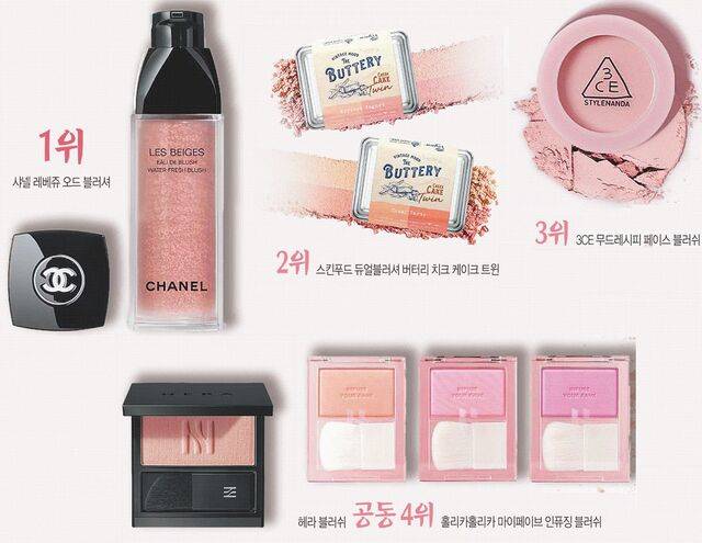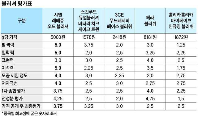 공동 4위가 나왔다. ‘헤라 블러쉬’와 ‘홀리카홀리카 마이페이브 인퓨징 블러쉬’(이상 2.5점)였다. 다만 헤라는 사용감 중심으로 점수를 매긴 1차 평가에서 1위, 전성분 평가에서도 최고점을 받았다. 표현력이 뛰어나고 발색력, 밀착력, 지속력 등에서 호평받았으나 g당 가격이 최고가인 게 최종 순위를 결정했다. 고진영 원장은 “은은한 펄감이 자연스럽게 표현돼 여러 차례 덧발라도, 초보자가 사용하기에도 부담 없는 제품”이라고 했다. 최윤정 작가는 “펄이 있는 제품은 얼굴에 입체감을 줄 수 있는 게 장점이지만 펄이 모공에 끼일 수 있는 건 주의해야 한다”고 했다.