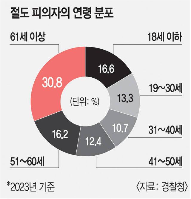 연령대별로 보면 60대 이상 고령층 비중이 가장 컸다. 경찰청 범죄 통계에 따르면 2023년 기준 전체 절도 범죄 피의자 중 61세 이상이 30.8%를 차지했다. 전문가들은 절도 범죄 피해 금액의 75.8%가 100만원 이하인 것을 고려할 때 생계형 범죄에 내몰린 고령층이 증가한 것으로 분석했다.