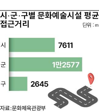조사 결과에 따르면 자동차를 타고 공연장·영화상영관·박물관·미술관·문학관 등의 문화예술시설에 접근할 때까지 걸리는 시간이 시와 구 지역은 평균 12.5분과 5.5분이 소요됐지만, 농촌이 대다수인 군 지역은 22.1분이 필요했다.