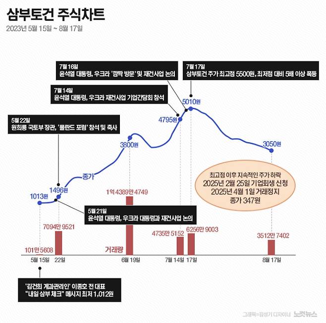 조 전 회장이 대부분의 잔여 지분을 정리한 후 삼부토건 주가는 내리막길을 걷기 시작했다. 야심차게 추진 계획을 밝혔던 우크라이나 재건사업은 진행되지 않았고 회사는 유동성 위기에 허덕였다.
