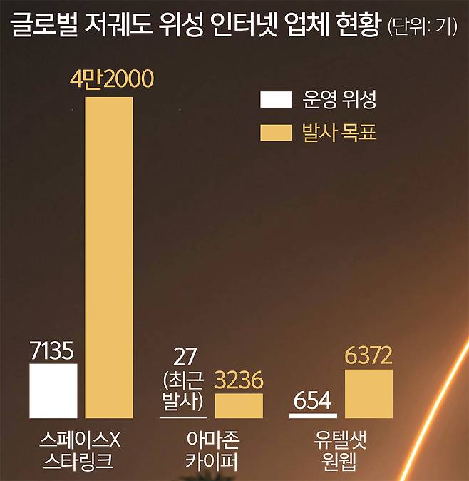 저궤도(LEO) 위성통신의 중요성이 커지고 있지만 한국이 보유한 인공위성 수는 미국과 비교가 무색할 만큼 적다. 미국 스페이스X가 이미 지구 저궤도에 통신용 위성 7135기를 쏘아올린 데 반해 한국은 이제야 걸음마를 뗐다. 양국 발사체 기술 격차가 워낙 큰 데다 한국은 그간 관측위성에 집중해 통신위성은 사각지대였기 때문이다.