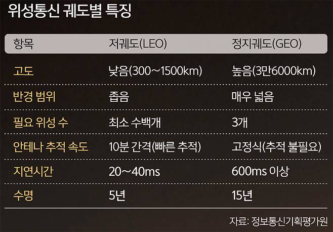 11일 과학기술계에 따르면, 저궤도 위성통신은 정지궤도가 아닌 고도 300∼1500㎞를 88∼127분 주기로 공전하는 위성을 이용한 통신 방식이다. 정지궤도 위성의 고도가 3만6000㎞인 반면 저궤도는 지상과 거리가 가까워 데이터 전송속도가 빠르고 지연시간이 짧다. 저궤도는 지연시간이 20∼40㎳여서 정지궤도 위성(600㎳ 이상)보다 실시간 통신이 원활하다. 인터넷 속도도 LTE급 이상이다.