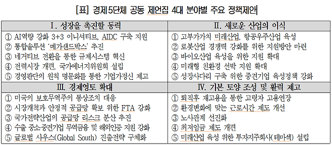 경제5단체가 이날 발표한 ‘미래성장을 위한 국민과 기업의 제안’ 제언집에는 미래와 성장에 초점을 맞춰 경제 전 분야에 걸쳐 차기정부가 꼭 추진해야할 100대 정책과제가 담겼다. 경제5단체는 제언문에서 “과거의 성장공식은 통하지 않고 새로운 전략이 절실한 만큼, 다가오는 대선은 한국경제라는 나무를 다시 키울 전환점이 돼야 한다”고 강조했다.