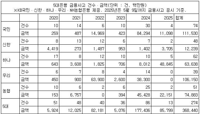 단일 사고 규모로는 하나은행이 지난달 14일 공시한 외부인 사기에 의한 금융사고가 305억원으로 가장 컸다.