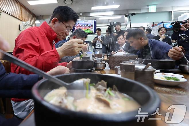 (서울=뉴스1) 이동해 기자 = 김문수 국민의힘 대선 후보가 제21대 대통령 선거 공식 선거운동이 시작된 12일 새벽 서울 송파구 양재대로 가락시장을 방문해 상인들과 순대국밥을 먹고 있다. 2025.5.12/뉴스1