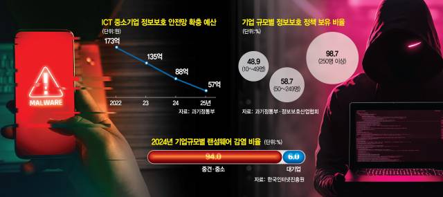 12일 과학기술정보통신부에 따르면 중소기업 대상 정보보호 컨설팅과 보안솔루션을 지원하는 ICT 중소기업 정보보호 안전망 확충 예산은 올해 57억 원으로 지난 해 88억 원 대비 35.2% 감소했다. 기업의 디지털 전환이 가속화하며 사이버 침해 피해가 증가하고 있음에도 2022년 173억 원으로 정점을 찍은 중소기업 정보보호 예산은 되레 2023년 135억 원으로 줄어든 후 하락세를 이어가고 있다. 이런 가운데 사이버 공격은 중소기업에 집중되고 있다. 한국인터넷진흥원(KISA)에 따르면 지난 해 랜섬웨어 감염 사고 195건 중 중소기업이 94%에 달했다.