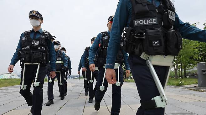 기동순찰대원들은 국내 로봇 기업 위로보틱스의 웨어러블 보행보조로봇 '윔S'를 착용하고 도보 순찰에 나섭니다.