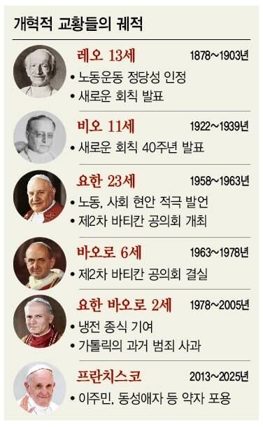 프란치스코 교황은 제2차 바티칸 공의회(1962~1965년) 이후 50년 만에 탄생한 개혁 교황이다. 그를 도와 교회 인사를 총괄하는 주교부 장관으로 일했던 레오 14세 새 교황 역시 프란치스코는 물론 레오 13세, 요한 23세 등 교회 안에 머물지 않고 세상으로 눈을 돌린 개혁적 교황들의 궤적을 이어갈 것으로 관측된다.