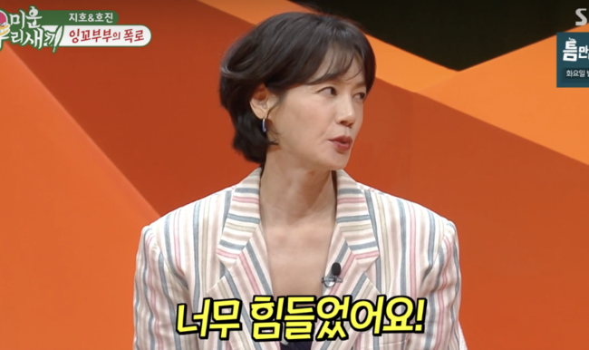 김지호는 남편 김호진과 연예계 대표 잉꼬부부로 알려져 있지만, 정작 본인은 “잉꼬가 뭐예요?”라며 현실적인 부부 생활을 고백해 웃음을 자아냈다. “(신혼 초엔) 닭싸움하듯 매일 싸웠다. 성향이 너무 달라 맞추느라 힘들었다”고 말하며, “내가 금방 잊고 아무렇지 않게 굴면 남편은 더 화났다. 싸운 직후에도 방송·CF 촬영이 많아 카메라 앞에서 하트를 날려야 했는데 정말 괴로웠다”며 ‘쇼윈도 부부’ 같은 현실을 고백했다.