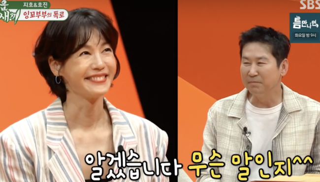 ‘다시 결혼해도 김호진과 할 거냐’는 질문엔 말없이 하늘을 올려다본 김지호. 이를 본 MC들은 “그 표정이면 다 알겠다”며 폭소했다. 김지호는 “5~6년 전엔 절대 안 했을 것 같았지만 지금은 또 할 수도 있겠다 싶다”며 “남편이 늘 배려해주고, 예뻐해주고 자랑해주는 사람”이라며 급 수습에 나섰다.